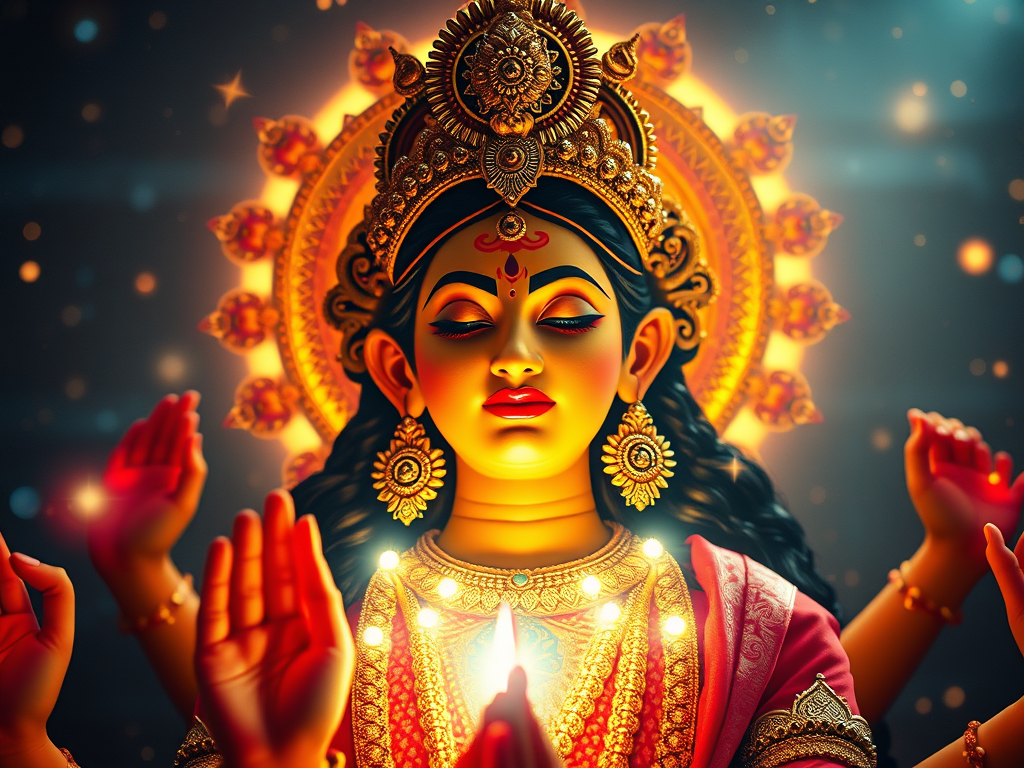 In the 12th and 13th chapters, Devi promises that all misfortunes of the devotees will be destroyed and they will get all the material and spiritual benefits, just by reciting or remembering Her glory.